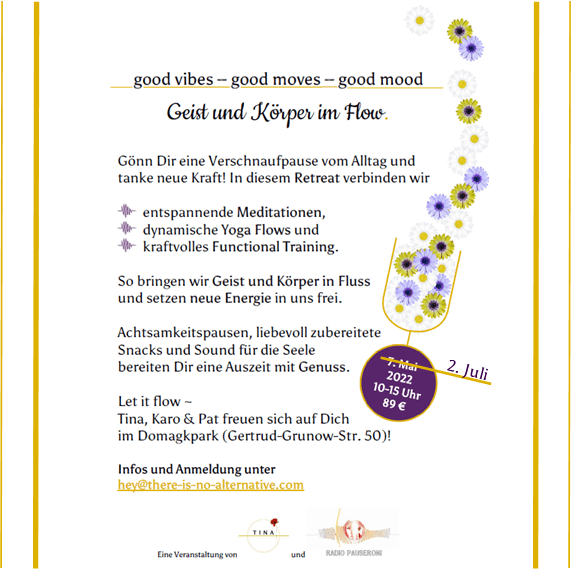 Radio Pauseroni und TINA veranstalten mehrmals pro Jahr das good vibes – good moves – good mood Retreat, in dem wir Elemente aus Achtsamkeit, Atmung, Meditation, Koordination, Kraft, Beweglichkeit, HIIT und mehr kombinieren um dir ein ganzheitliches Programm zu bieten, das dich neu fokussiert und gleichzeitig entspannt, auspowert und zugleich energetisiert.